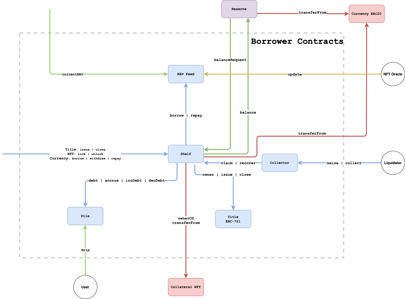 On the other hand, the borrow module keeps track of the individual loans from the asset originators.